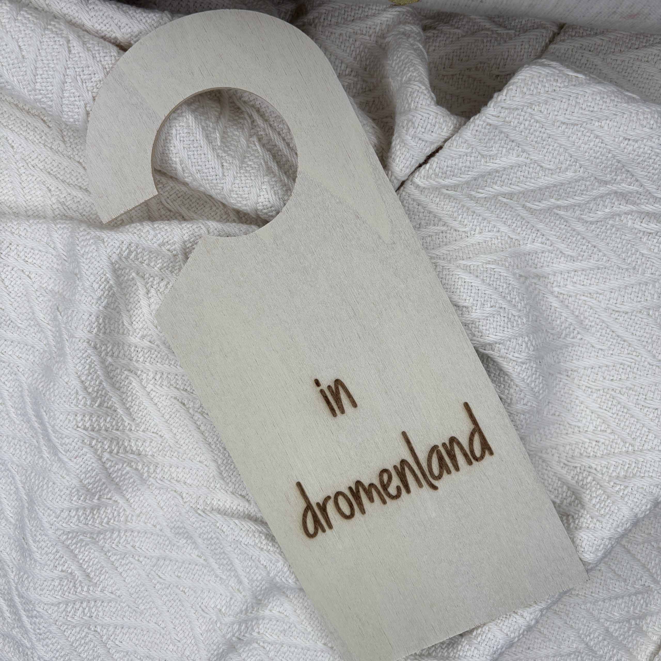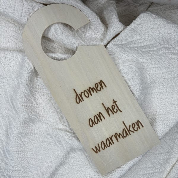 Een houten deurhanger die aan beide kanten werd gegraveerd met originele tekst.