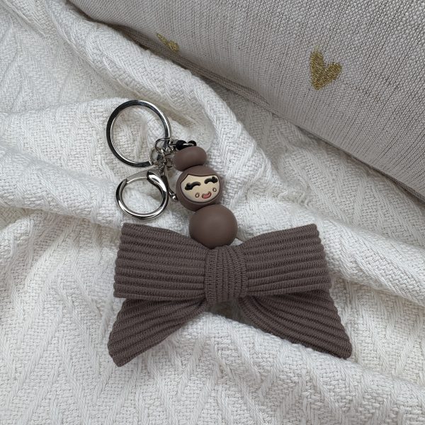 Een sleutelhanger met een popje van geluk, afgewerkt met een grote stoffen strik.